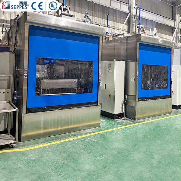 食品工廠刷洗間設計的快速卷簾門,采用拉鏈結構密封+PVC高韌門簾+304不...